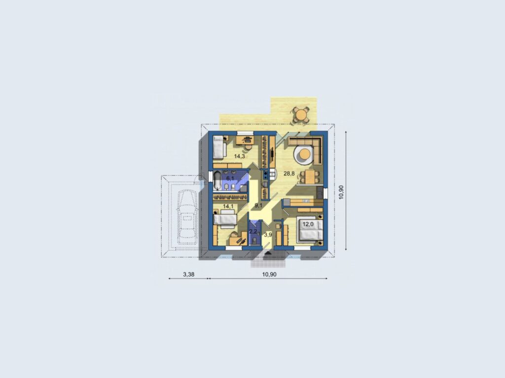 Dispozícia stavby je účelná, s dôrazom na otvorený denný priestor spojenej kuchyne s obývačkou a svetelnosť tohto „srdca domu“, kde sa stretáva rodina a priatelia. Súčasťou domu sú dve samostatné izby, spálňa, kúpeľňa, samostatné WC a komora. Vytvoriť si atmosféru podľa seba umožňuje príprava na krb v obývacej miestnosti.